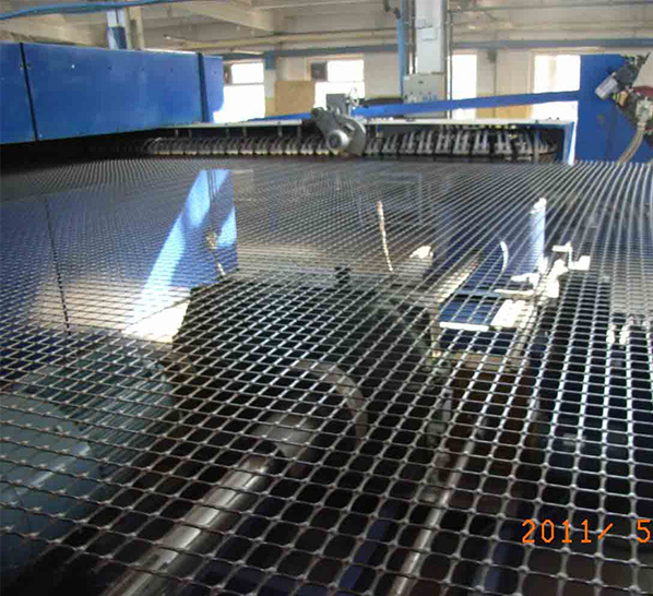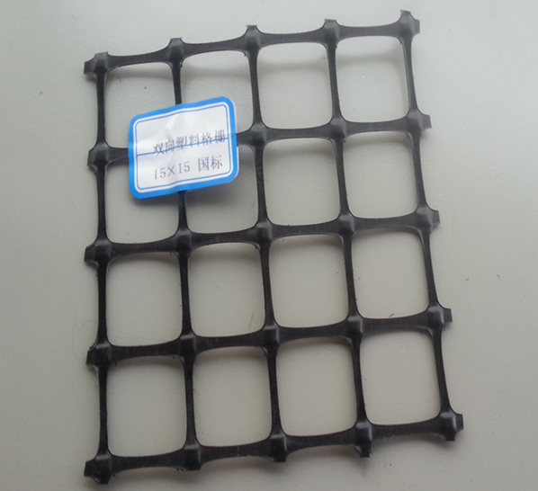 雙向拉伸塑料土工格柵是以聚丙烯(PP)或聚乙烯(PE)為原料,經(jīng)塑化擠出板材、沖孔、加熱、縱向拉伸、橫向拉伸而成。該材料在縱向和橫向上都具有很大的拉伸強(qiáng)度,這種結(jié)構(gòu)在土壤中能夠提供一個更為有效的力的承擔(dān)和擴(kuò)散的理想連鎖系統(tǒng),適應(yīng)于大面積承載的地基補(bǔ)強(qiáng)。