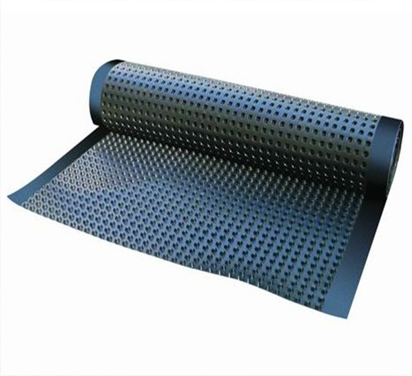 排水板是由聚苯乙烯(HIPS)或者是聚乙烯(HDPE)塑膠底板經(jīng)過沖壓制成圓錐突臺或者加勁肋的凸點(或中空圓柱形多孔)而成,幅寬有3米,長度有10米或者是15米。