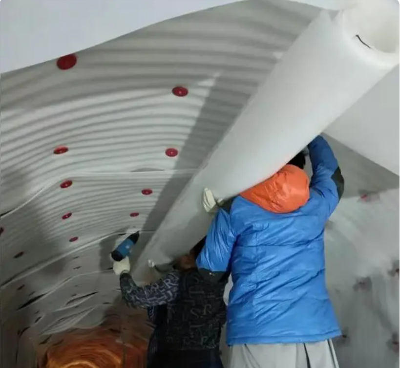 隧道EVA吊掛式防水板的安裝方法是:先在基礎(chǔ)表面涂刷專(zhuān)用膠水,然后將防水板吊掛在基礎(chǔ)表面上,并用專(zhuān)用膠水將各板材粘接在一起,最后用專(zhuān)業(yè)工具在板材連接處進(jìn)行密封處理。該防水板施工完畢后,可在其表面覆蓋一層防護(hù)層,以保護(hù)其不受外力破壞和污染。